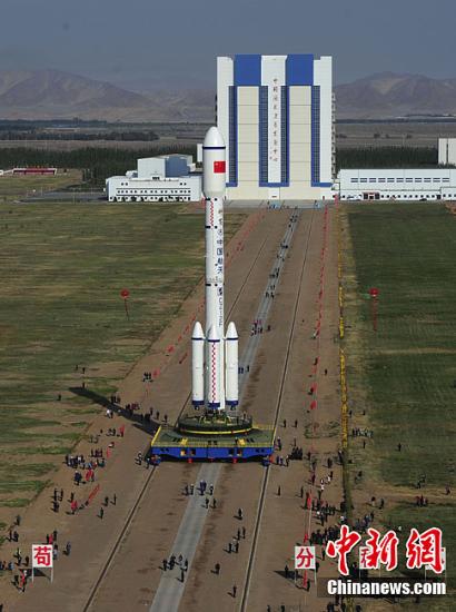 中國(guó)載人航天工程新聞發(fā)言人9月20日對(duì)外宣布,中國(guó)將于9月27日至30日在酒泉衛(wèi)星發(fā)射中心擇機(jī)發(fā)射“天宮一號(hào)”。目前,“天宮一號(hào)”目標(biāo)飛行器、“長(zhǎng)征二號(hào)F”運(yùn)載火箭組合體已轉(zhuǎn)運(yùn)至酒泉衛(wèi)星發(fā)射中心發(fā)射區(qū)。圖為轉(zhuǎn)運(yùn)途中。中新社發(fā) 宿東 攝