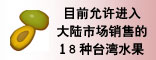 臺(tái)灣省農(nóng)會(huì)理事長古源俊介紹說,大陸已同意臺(tái)灣的十二種水果,四月間可以免稅、專案綠色通關(guān)方式進(jìn)入北京、上海市場銷售。 |