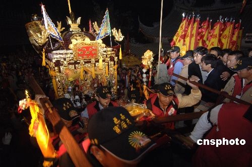 隨進(jìn)香團(tuán)一行一同抵達(dá)的,還有九十二尊媽祖神像和嘉義天后宮的七頂神轎。“這是嘉義天后宮媽祖第一次回娘家。”此次活動(dòng)的組織者、嘉義天后宮董事長(zhǎng)蕭鎮(zhèn)煌告訴記者,“從嘉義布袋港出發(fā)前,我們舉行了祭海儀式,祈求風(fēng)平浪靜。在媽祖靈光庇佑下,一路果然平安順利。”