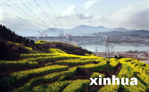 雄偉的三峽大壩在油菜花的映襯下顯得格外壯麗(3月13日攝)