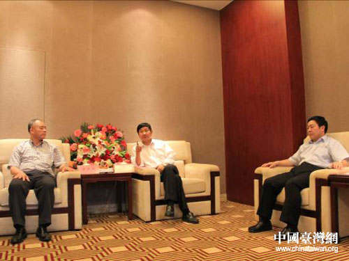 駐馬店市委副書記、市長劉國慶(中)與臺灣照明公會代表、井得企業有限公司(集團)總裁黃明智(左)親切交談。圖片來源:駐馬店市臺辦