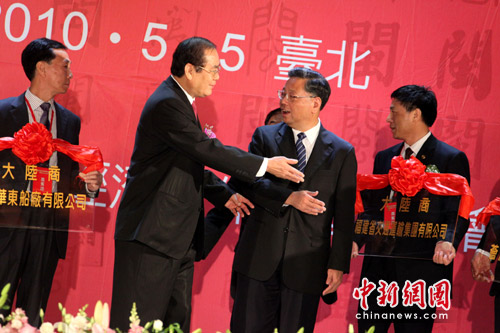 中新網臺北5月5日電 “福建赴臺投資企業授牌暨閩臺合作項目簽約儀式”5日下午在臺北舉行,福建省長黃小晶(前右)、中國國民黨副主席曾永權為8家已獲兩岸行政部門核準的企業授牌。