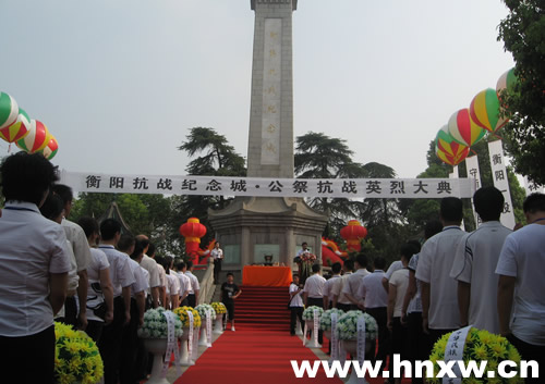中新網(wǎng)衡陽8月8日電(劉源西)勿忘國恥,振興中華。8日上午,湖南衡陽市在衡陽保衛(wèi)戰(zhàn)標(biāo)志性建筑“衡陽抗戰(zhàn)紀(jì)念城”前舉行公祭抗日英烈大典,紀(jì)念抗戰(zhàn)勝利65周年和祭奠66年前在衡陽保衛(wèi)戰(zhàn)中英勇獻(xiàn)身的民族英烈。來自海鮮兩岸的各界人士和當(dāng)年參加過衡陽保衛(wèi)戰(zhàn)的老戰(zhàn)士代表近300人參加了公祭大典。