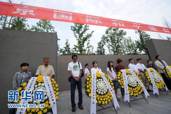 8月15日,參加和平集會的日本友人向南京大屠殺遇難者敬獻花圈。當日,二戰被日本強擄勞工遇難者家屬、日本友人和南京各界人士等300多人在侵華日軍南京大屠殺遇難同胞紀念館的和平公園舉行和平集會,祭奠30萬南京大屠殺遇難同胞,紀念中國人民抗日戰爭勝利65周年。新華社記者 韓瑜慶 攝