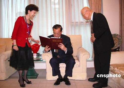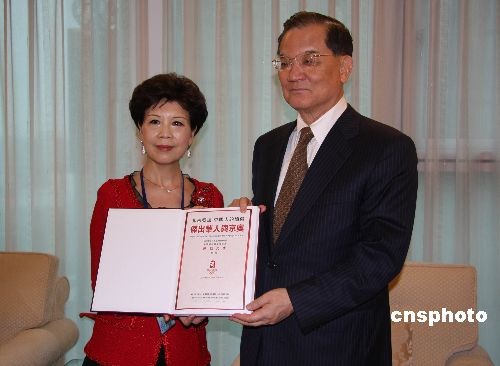 圖為胡葆琳團長(左)向連戰(右)贈送紀念品《杰出華人與京奧》