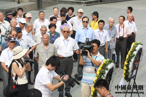 海內外黃埔軍校同學會的校友、親屬、專家學者24日下午參觀了侵華日軍南京大屠殺遇難同胞紀念館,為遇難同胞敬獻花圈。(中國臺灣網 肖燕 攝)