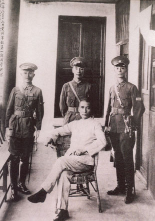1924年6月16日,孫中山在黃埔軍校開學典禮后,同蔣介石(中)、何應欽(左)、