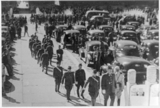 中國受降主官召日軍投降代表華北方面軍司令官根本博中將率領參謀長高橋坦以下廿一員幕僚入場。