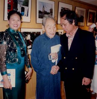 朗靜山大師(中間)與作者謝雨辰夫婦(合影于二哥影展現場)