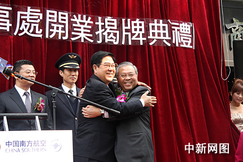 1月15日,大陸南方航空公司在臺北正式成立辦事處,成為首家在臺灣掛牌運營的大陸企業。圖為開業揭幕儀式典禮上,南航董事長司獻民(左一)與臺灣華航董事長魏幸雄熱情擁抱。中新社記者 陳立宇 攝