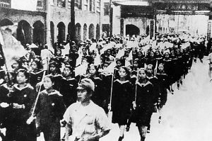 | 1945年10月,臺灣學(xué)生舉行游行,慶祝抗戰(zhàn)勝利和臺灣回歸祖國。 |