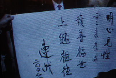 進行完禮物贈送之后,連戰來到連氏宗祠前,揮毫題詞:明心見性,垂教后嗣,積善福世,上繼祖德,表達對先祖的崇敬和緬懷之情。