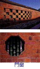 門窗:在這部份造型或材質上有各種不同的變化,裝飾意味居多,在余三館里,常見的板門及格扇和木欞窗,正廳步口廊的兩根梭形柱之間,鑲了個花瓶形木框門,創意十足,且意味著平安。窗子的花樣有內護龍紅墻上的竹節八卦窗,橫隔內外埕的矮墻則裝飾了綠色花磚窗,采漏空的上釉或素燒花組砌而成。 |