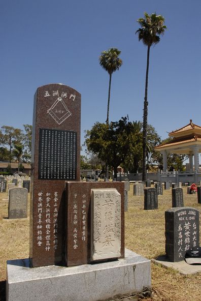 2011年7月19日,受五洲洪門致公總堂周國(guó)祥會(huì)長(zhǎng)委托,五洲洪門致公總堂中文書(shū)記趙善璘率內(nèi)堂三科職員(紙扇、紅棍、草鞋)專程來(lái)到洛杉磯中華墳場(chǎng)內(nèi),在剛剛修繕完工的黃三德墓前,豎立起功德碑。