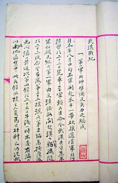 《武漢戰紀》分十六章,均為為熊炳琦手撰,分別蓋有“熊炳琦印”、“熊問梅”二印。書中有多處反復修改之處,也均出自熊之手。