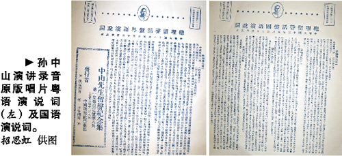 《中山先生留聲紀念集》封一印有孫中山國語演說詞四段,分別為:勉勵國民第一、勉勵國民第二、勉勵國民第三和告誡同志第四。封二印有孫中山粵語演說詞兩段,分別為:勉勵國民第一、勉勵國民第二。粵語內容和國語大致相同。當時報紙上還刊登了唱片的廣告:“外侮日亟,國難日殷,大家快醒!醒!先總理對于我國民有深切之告誡,欲救國強種,請聽孫總理生前親口演講留聲片。國語二片,粵語一片,每片兩元四角,上海南京路四百八十號本報留聲部發行。”(載于1932年5月4日《中國晚報》)