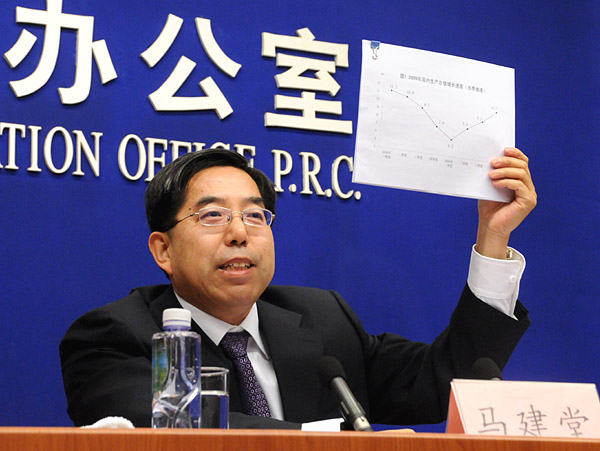 國家統(tǒng)計局局長馬建堂在國務(wù)院新聞辦公室舉行的新聞發(fā)布會上說,面對百年不遇的國際金融危機(jī)的嚴(yán)重沖擊和極其復(fù)雜的國內(nèi)外形勢,中共中央、國務(wù)院審時度勢,科學(xué)決策,帶領(lǐng)全國人民萬眾一心,共克時艱,堅持實行積極的財政政策和適度寬松的貨幣政策,全面實施并不斷完善應(yīng)對國際金融危機(jī)的一攬子計劃,較快扭轉(zhuǎn)了經(jīng)濟(jì)增速明顯下滑的局面,實現(xiàn)了國民經(jīng)濟(jì)總體回升向好。