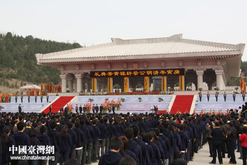 中國臺灣網4月5日陜西黃陵消息 庚寅(2010)年清明公祭黃帝典禮今日上午9時50分在陜西省黃陵縣橋山黃帝陵舉行,全國人大常委會副委員長烏云其木格,全國政協副主席、中共中央統戰部部長、中華海外聯誼會會長杜青林等領導同志分別向黃帝陵敬獻了花圈花籃,各省市、自治區、海內外華人代表和港澳臺同胞代表等萬余人參加了典禮,共同祭奠華夏人文初祖軒轅黃帝。