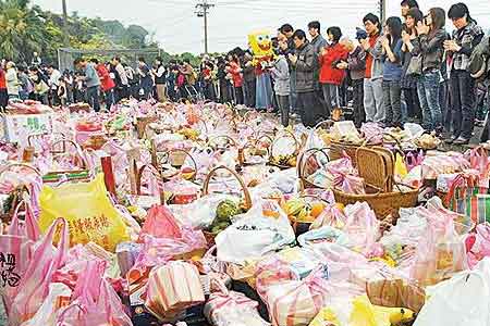 葉姓子孫帶著三牲、素果前來(lái)祭祖,一籃籃祭品堆滿廣場(chǎng)。圖片來(lái)源:臺(tái)灣《蘋(píng)果日?qǐng)?bào)》
