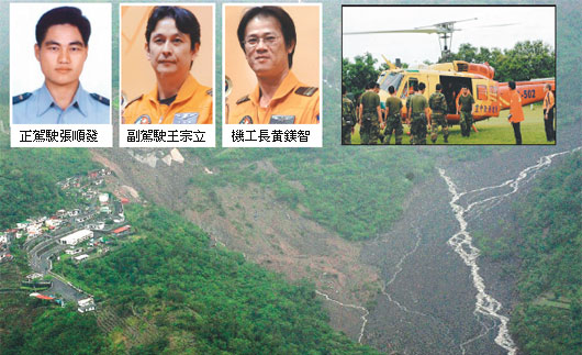 伊拉部落成孤島,張順發(fā)等3人駕UH-1H直升機(jī)飛往救人,不幸墜谷。圖片來(lái)源:臺(tái)灣《聯(lián)合報(bào)》。
