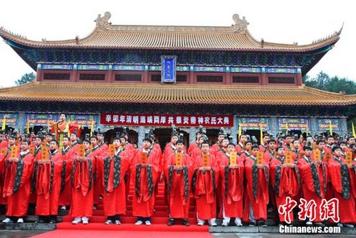 4月3日,“辛卯年清明海峽兩岸共祭炎帝神農氏大典”在中華始祖炎帝安寢地湖南株洲炎帝陵舉行,參加第二屆“在臺湘籍后裔湖南行”活動的臺灣鄉親及社會各界人士共200多人共植同根樹,表達對炎帝神農氏的無限景仰。臺灣中華湖湘文化發展協會理事長張京育、海協會副會長王在希、湖南省統戰部部長李微微等祭拜代表依次敬香、獻花籃、虔誠三鞠躬。