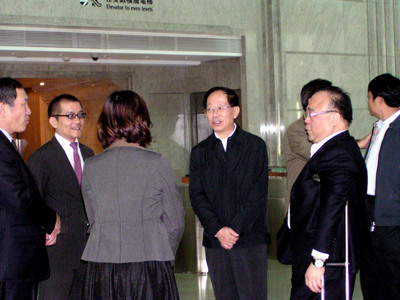 農業部副部長危朝安(右三)19日抵臺,傍晚與大成集團總裁韓家寰(右二)趨車至101造訪,登樓前與101執行副總趙國帥(左一)談天說地。危朝安對大樓設計頗感興趣,并拍了紀念照。