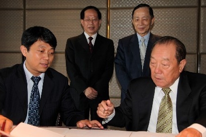 5月20日,在首度訪臺的海峽兩岸農業交流協會名譽會長危朝安(后排左)和臺灣二十一世紀基金會董事長高育仁見證下,雙方代表簽訂2010年合作備忘錄,將在年內合作舉辦“第二屆兩岸鄉村座談”等活動,深化兩岸農業、基層農民交流。
