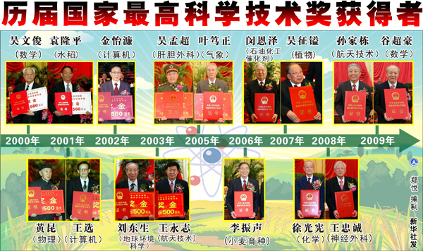 國家最高科學技術獎自2000年設立,歷屆獲獎者分別為:2000年,吳文俊、袁隆平;2001年,王選、黃昆;2002年,金怡濂;2003年,劉東生、王永志;2004年空缺;2005年,葉篤正、吳孟超;2006年,李振聲;2007年,閔恩澤、吳征鎰;2008年,王忠誠、徐光憲,2009年,孫家棟、谷超豪。
