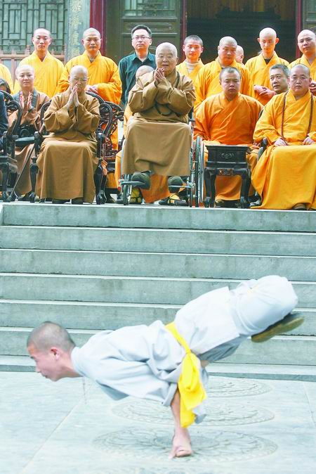 星云法師很風趣地說:“我謝謝你們!我坐在輪椅上很沉的,你們幾個武僧就像拎小雞一樣輕松地抬著我就走了,這也說明你們功夫修習得好,你們的功夫能助人,今天就幫助了我。我謝謝你們!在臺灣的佛光山之外,在世界上我們還建了幾個佛光山,你們到世界各地的佛光山都是佛光山的貴賓,我還要請少林武僧到佛光大學傳授武術。”一番話令年輕的武僧們歡呼雀躍。