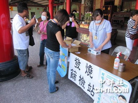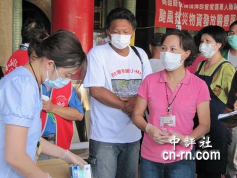 防范甲型流感,醫護人員組成發燒篩檢站,每天替災民測量體溫。來源:中評網