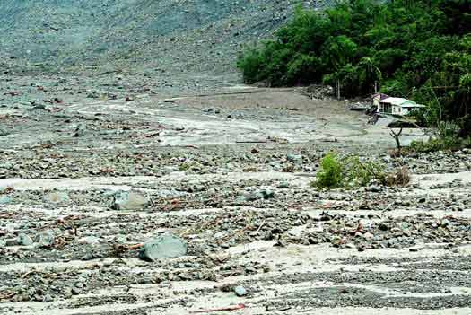 一度傳聞有700人遭活埋的重災(zāi)區(qū)高雄縣甲仙鄉(xiāng)小林村,全村只剩地勢最高的兩間民房,其它房舍全給泥石流埋掉,不見蹤影。(圖片來源:臺灣《聯(lián)合報(bào)》)