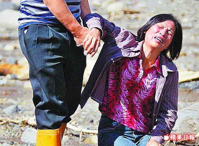 仰天悲鳴,家園不在,前來尋親的婦人潘金貴跪地痛哭。來源:臺灣《蘋果日報》