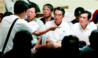 馬英九(右一)、“農委會主委”陳武雄(右二)與小林村災民座談,說明將建組合屋及永久房屋安置災民。圖片來源:臺灣《聯合報》