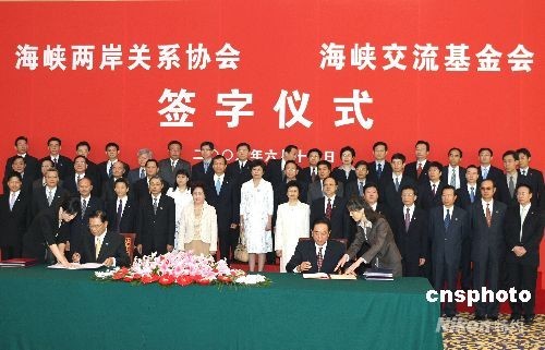 6月13日上午,海峽兩岸關系協(xié)會會長陳云林與臺灣海峽交流基金會董事長江丙坤在北京釣魚臺五號樓簽署“兩岸周末包機”和“大陸居民赴臺旅游”協(xié)議 。 中新社發(fā) 任晨鳴 攝
