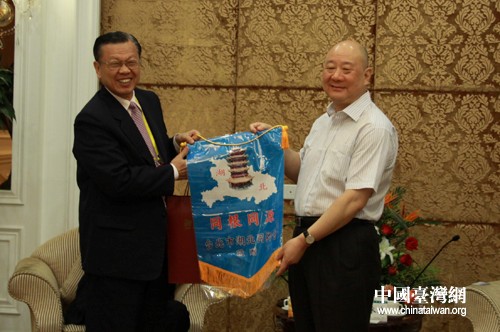 湖北省副省長田承忠接受臺北市湖北同鄉(xiāng)會贈送的“同根同源”錦旗(中國臺灣網(wǎng) 徐維彬 攝)
