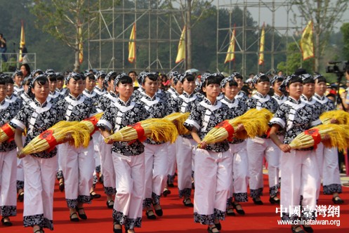 圖為是由80名青春少女組成的五谷方陣。少女們手捧稻、黍、稷、麥、菽五谷形狀的道具,既表達著對炎帝神農“始植五谷”不朽功德的崇敬之情,也祈愿著國泰民安、風調雨順、五谷豐登、欣欣向榮。 (中國臺灣網 徐維彬 攝)