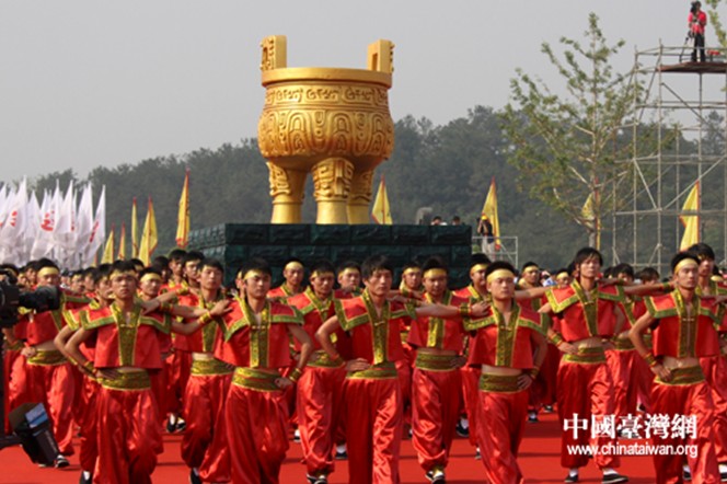 由72名精壯男子組成的古鼎方陣。鼎,在古代象征著國家權力;在今天則喻示著人民團結、祖國強盛、中華崛起和民族復興。(中國臺灣網 徐維彬 攝)