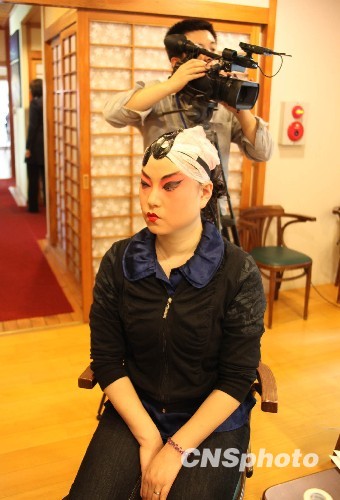 3月18日,來自蘭州職業(yè)技術(shù)學(xué)院京劇團(tuán)的女生在臺(tái)北市長官邸為媒體反串表演了《鍘美案》和《貴妃醉酒》的片段,以此揭開蘭州職業(yè)技術(shù)學(xué)院將于19日在臺(tái)北新舞臺(tái)首演的序幕。圖為扮演楊貴妃的女生在臨時(shí)后臺(tái)候場。中新社發(fā) 閆曉虹 攝