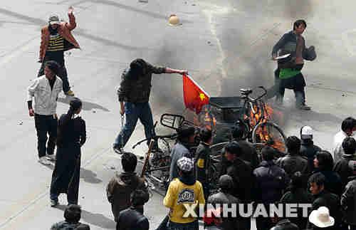 “3·14”拉薩暴力事件發(fā)生時(shí),凡是門口懸掛哈達(dá)的商鋪都“幸免于難”,而其他一些在門口做了“大起義”英文縮寫“T·G·C”標(biāo)記的店鋪則被洗劫一空,甚至付之一炬,“以純服裝店”5個(gè)花季少女更是葬身火海。暴徒們“聲東擊西”、“多點(diǎn)出擊”,在更大范圍內(nèi)打砸搶燒,進(jìn)行破壞。