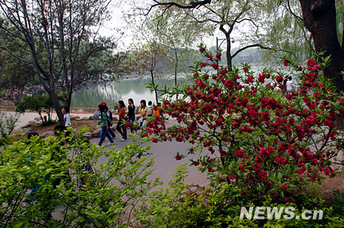 4月19日,學生從桃花盛開的北京大學未名湖畔走過。新華網 文濤 攝