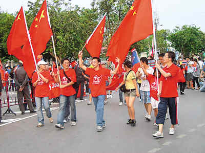 19日,北京奧運(yùn)圣火到達(dá)泰國曼谷,曼谷的學(xué)子們張開自己的雙臂,在大雨中用滿腔的熱情點(diǎn)亮了另一盞燃燒在心中的愛國火炬。