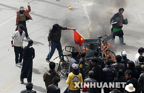 這張路透社播發的照片顯示,3月14日, 在拉薩市,一名右手持鐵鏈的不法分子在焚燒中國國旗,另一名不法分子手持長刀。新華社發
