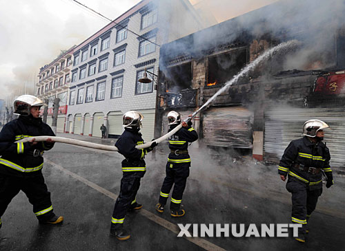 3月14日,消防官兵在拉薩市街頭滅火。 新華社記者 覺果 攝