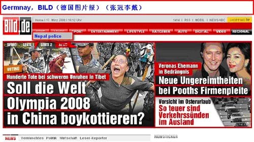 這是尼泊爾警察用棍棒驅趕示威者的圖片,被德國圖片報冠以“西藏數百人死亡,抵制中國2008奧運會?”的標題。
