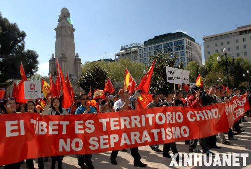 4月14日,西班牙上千名華人華僑和留學生在馬德里市中心的西班牙廣場舉行游行集會活動,反對西藏分裂,反對西方歪曲報道,維護統(tǒng)一,支持北京奧運。 新華社記者陳海通攝
