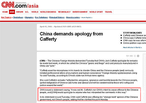 CNN在不久前關于西藏事件的報道,就曾惡意剪裁圖片,并“誤稱”西藏為“國家”,顯示其所謂的新聞自由在偏見主宰下,常常干出渲染夸張﹑移花接木﹑斷章取意﹑指鹿為馬的奇事。而此番卡弗蒂于奧運火炬在歐美數國遭遇阻撓的敏感時刻,大開罵戒,則亮出了他勢與中國和中國人過不去的架式與底牌,更喪失了一個媒體人的公正與風度。難怪中國網民已經流傳“做人不要太CNN!