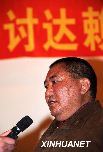 中國佛教協會西藏分會會長珠康·土登克珠活佛強烈譴責參與拉薩打砸搶燒事件的不法分子(3月20日攝)。 3月14日,在達賴集團一手策劃下,拉薩發生了有組織、有預謀的打砸搶燒嚴重暴力犯罪事件,給各族人民的生命財產安全造成極大危害,嚴重擾亂安定團結的社會局面,嚴重阻撓經濟社會各項事業的發展,激起了西藏自治區各族各界干部群眾的強烈憤慨。 新華社記者覺果攝