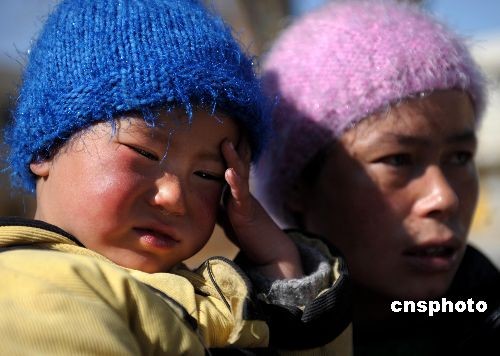 在拉薩市救助站內接受救助的一對母女。3月22日,拉薩大昭寺的僧人到拉薩救助站慰問打砸搶燒事件中的受害者,并向他們發放了慰問金。中新社發 廖攀 攝