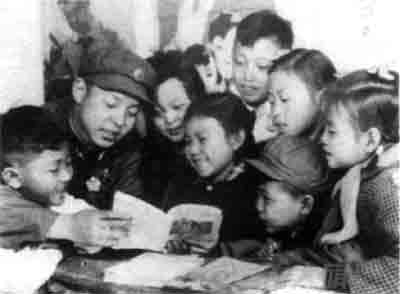 雷鋒把雨衣披在大嫂身上,抱起那個大一點的孩子冒雨朝樟子溝走去,寧可自己淋得透濕,一直走了兩個多小時,才把她們母子送到家。
