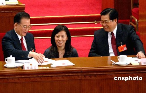 三月十五日上午,十一屆全國人大一次會議第五次全體會議在北京人民大會堂舉行。圖為會議進行投票間隙,胡錦濤(右)、溫家寶(左)與奧運冠軍楊揚在主席臺上交談。中新社發王東明攝